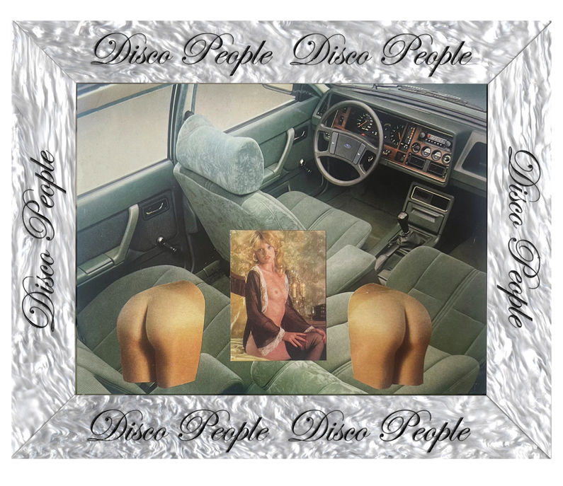 Photo Montage featuring a collaged Miss Kier on a 1982 Honda Accord magazine advertisement. Framed in an Acrylic, Timber, Plywood and Wine Leather frame that is engraved with the repeated motif 'A Love Sweet Sound'.