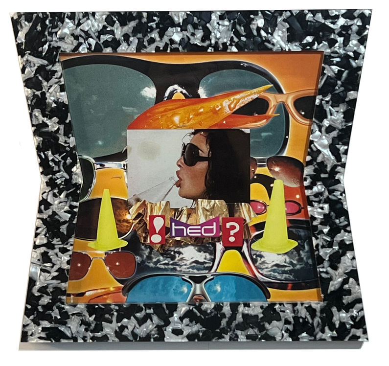 Collage in 5-layered acrylic frame, made from spray painted acrylic, sanded for a matte finish with engraved nameplate and hook
